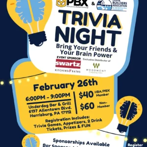 2026 Central HBA/PBX Trivia Night Fees/Admission HBA or PBX Member: $40 Non-Member: $60 Registration Includes: Trivia Games Appetizers 2 ... 26 Feb 6:00 pm - 9:00 pm