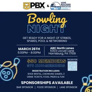 2026 Central HBA/PBX Bowling Night Fees/Admission HBA or PBX Member: $50 Non-Member: $70 Registration Includes: Shoe Rental 2 Bowling ... 26 Mar 5:00 pm - 8:00 pm ABC North Lanes5303 Locust Ln. Harrisburg, 17109